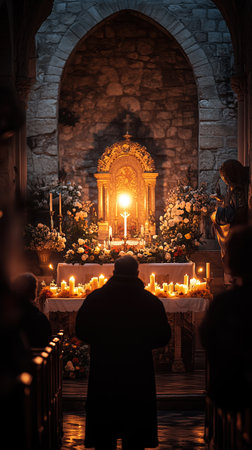 In a dimly lit church, a priest lights the Easter candle, casting a warm glow over ornate decorations. The atmosphere is filled with reverence, symbolizing tradition and spiritual renewal.