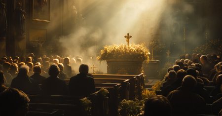 During an evening service, a priest performs the sacred Eucharist ceremony at a richly adorned church filled with warmth and reverence