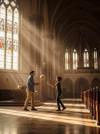 A heartwarming scene of two men enjoying a casual game of ball inside a stunning church with breathtaking stained glass windows and arched architecture.