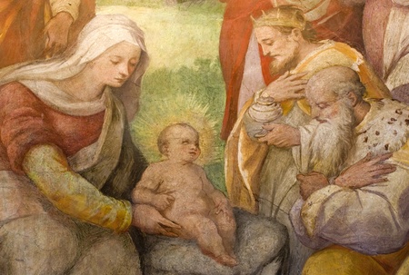 PRAGUE, CZECH REPUBLIC - APRIL 5, 2016: Stained Glass in the Basilica of Vysehrad in Prague, Czech Republic, depicting the visit of the Three Kings to the Infant Jesus