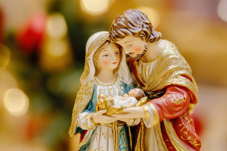 Christmas nativity scene with holy family statue holding baby jesus with blurred christmas tree lights in background