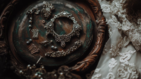 Discover an exquisite vintage jewelry collection displayed on a beautifully aged wooden plate. The intricate designs and textures highlight artisan craftsmanship.
