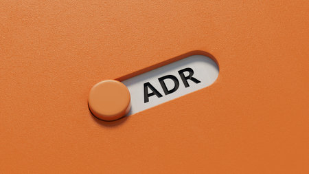 ADR Alternative Dispute Resolution text with Calculator, alarm clock and magnifying glass on marble background