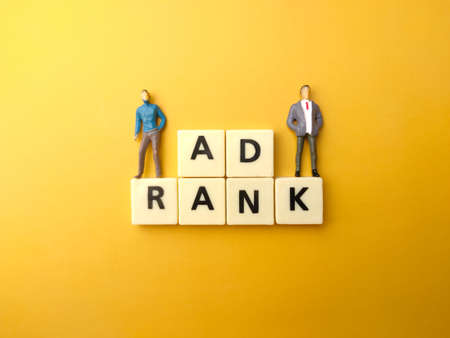 Miniature people and toys word with text AD RANK on yellow background.