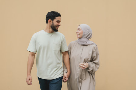 muslim couple looking at each other and smiling isolated on beige
