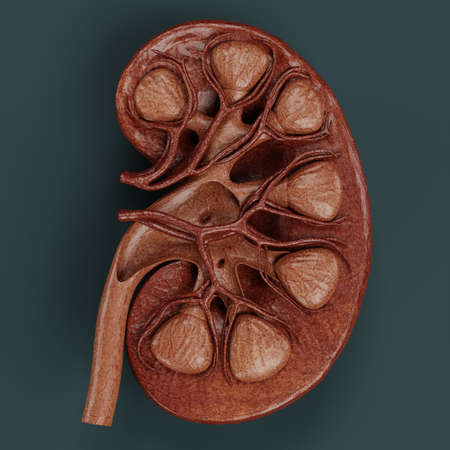 Colorful anatomical model of the human kidney is shown, revealing the internal structure of this important organ