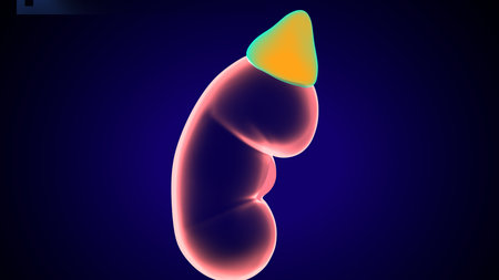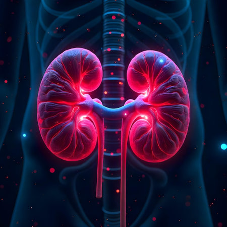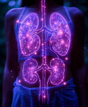 Hyper-realistic 3D model of human kidney glowing against a dark backdrop for medical study