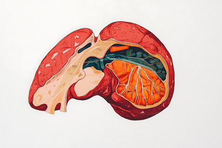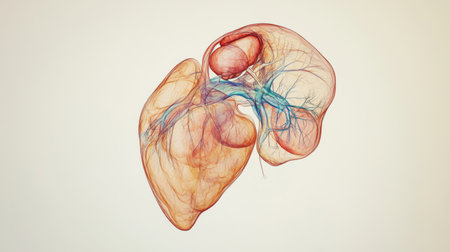 Anatomical model of the human liver with detailed sections illustrating hepatic function and anatomy.