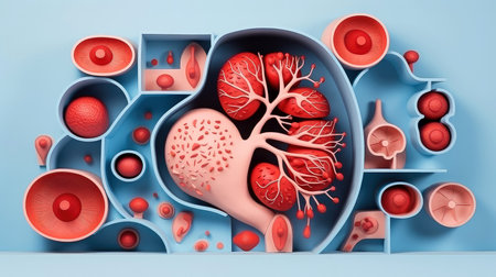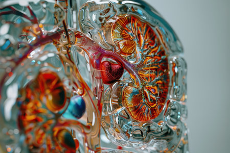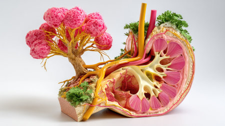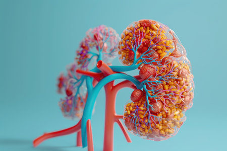 This vibrant 3D rendering showcases a human kidney with intricate vascular structures, ideal for educational and medical use. The creative design highlights the organ's anatomy and surrounding features in a visually appealing format.