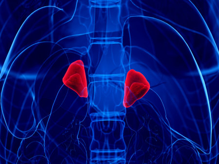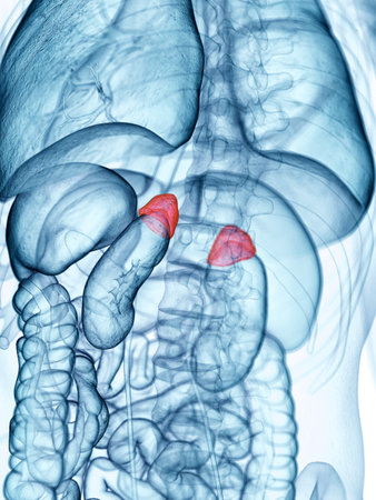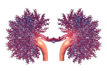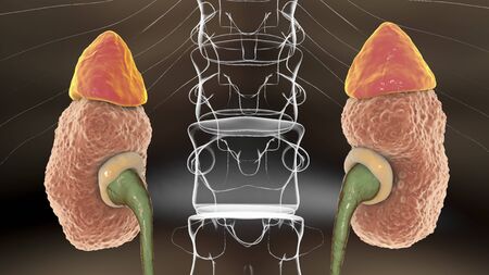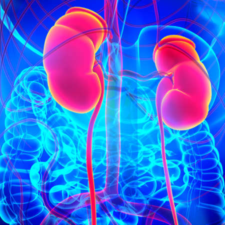 A close up of a pair of kidneys with red and orange blood vessels. The image is a representation of the human body and its internal organs