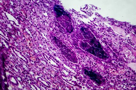 Histopathology of acute nephritis, light micrograph, photo under microscope