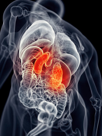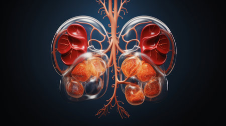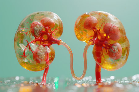 Detailed illustration of human kidneys and vascular structures, showcasing anatomy and functionality. Ideal for educational and medical purposes.
