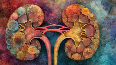 A colorful representation of human kidneys displays intricate patterns and structures. The image focuses on the shapes within the kidney showing biological features vividly.
