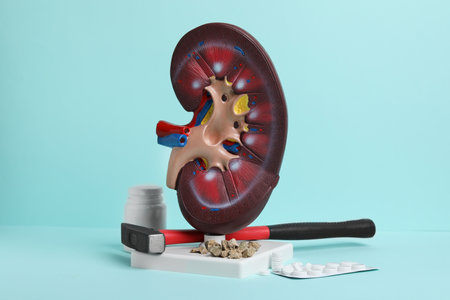 3D anatomical model of kidneys is on blue background surrounded by white pills as ornament polka dots. Medical concept by pharmacological tableted treating renal disease, pharmacotherapy chemotherapy