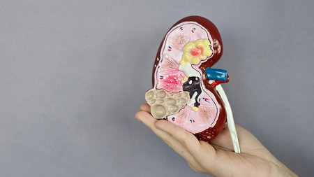 Detailed model of a human kidney held in a hand for educational purposes in a neutral setting