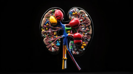 Detailed kidney anatomy illustration in vibrant colors set on moody black background