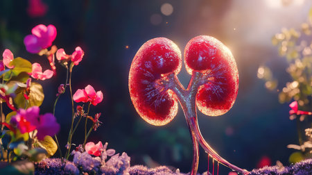 A stunning artistic depiction of human kidneys set against a vibrant floral garden backdrop, symbolizing health, nature, and the beauty of life.