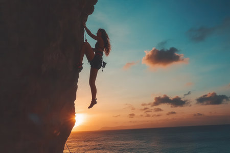 Female climber ascending cliff face at sunset overlooking ocean