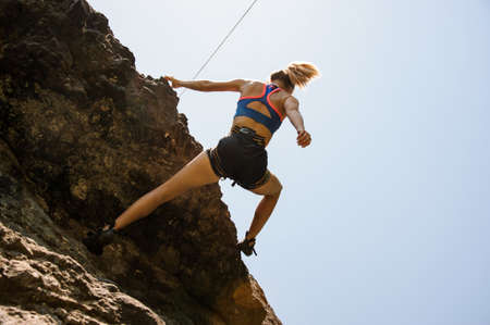 Low angle close up young caucasian sporty woman training steps on rock climb outdoors in sunny hot weather alone. Inspirational active strong woman sports activities outdoors