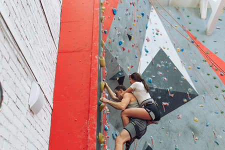 muscular man with a girl training in indoor clymbing gym.man and woman climbing down