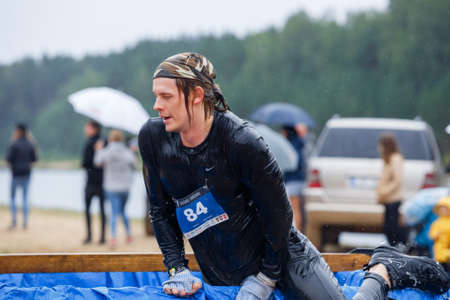 Poznan, Poland - June 2021: An hard extreme obstacle course Survival Race at rainy day
