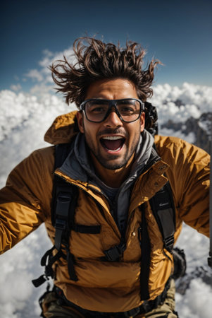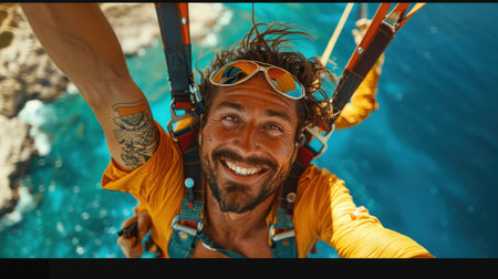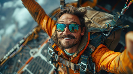 Extreme Delight: Happy Man Skydiving in Free Fall with a Parachute. Adrenaline freedom: Skydiving awakened happiness, the face of a joyful person.