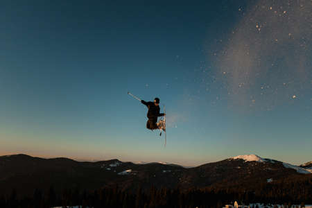 amazing view of snowy mountain slope and skier making trick in jumping through air