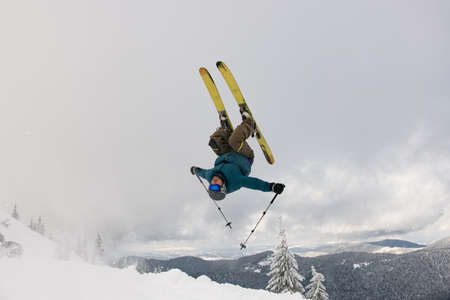 freeride skier performs jump in the air over a snow-covered mountain slope