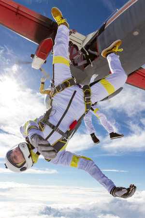 Skydiving. Exit. Opened door. The beginning of the tandem jump.