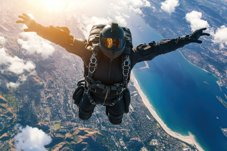 A tactical skydiver free-falls over a coastal city, arms spread wide, sunlight reflecting off helmet, with deep ocean and land below.