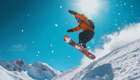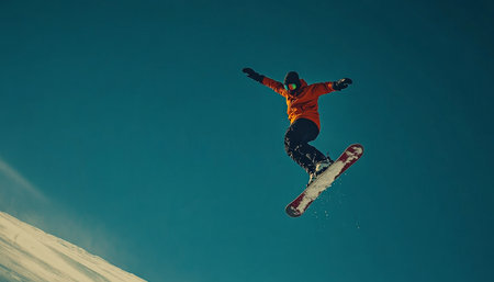 Snowboarder leaping against a vibrant blue sky captivating winter sports action shot