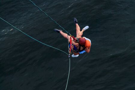 Belarus, Gomel, March 08, 2019. Jumping from the bridge to the rope.Ropejumping.Woman jumping from a high bridge on a rope