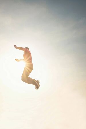 Jumping man in the sky. Man jumping in the sunshine against blue sky. Concept: freedom, success, energy, vitality.