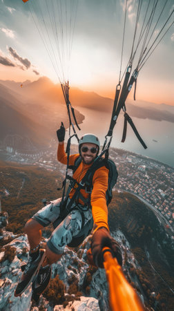 Skydiver selfie under orange parachute with sun flare, capturing extreme sports adventure and freedom in the open sky.