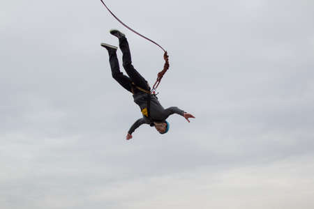 Belarus, Gomel, March 08, 2019. Jumping from the bridge to the rope.Ropejumping.A man jumps from a great height and flies on the rope in the sky. Extreme passion