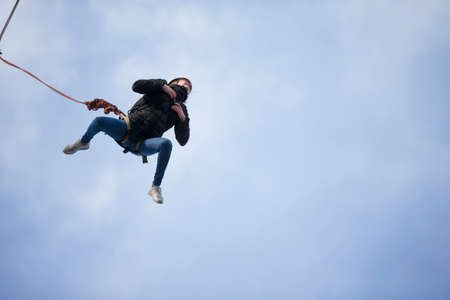 Belarus, Gomel, March 08, 2019. Jumping from the bridge to the rope.Ropejumping.Dangerous hobbies.Brave woman jumping from the bridge against the sky