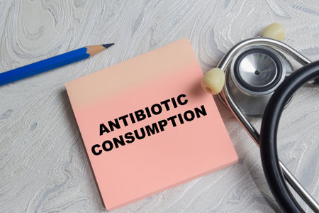 Concept of antibiotic consumption write on sticky notes isolated on Wooden Table.