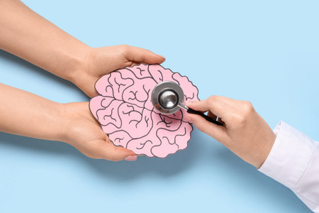 Female hands with paper human brain and stethoscope on blue background. Cancer concept