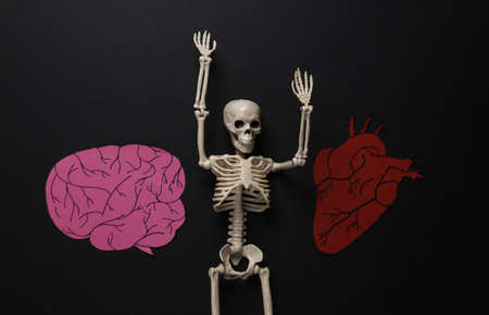 Skeleton and paper internal organs (brain and heart) on a black background