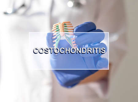 Costochondritis disease. Word on photo with ribs chest.