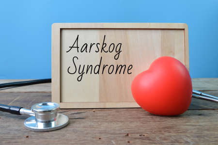 Stethoscope, red heart shape and wooden board with text Aarskog Syndrome