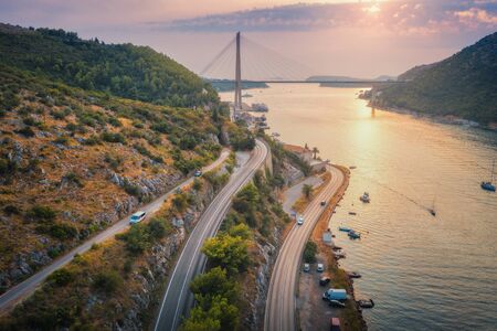 Aerial view of mountain roads and beautiful bridge at sunset. Dubrovnik, Croatia. Top view of road, boats, yachts, green trees. Summer landscape with harbor, sea coast, highway and cloudy sky