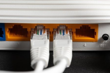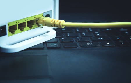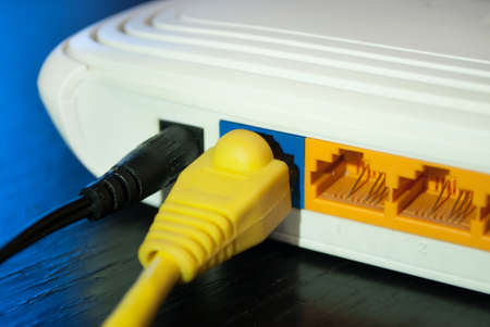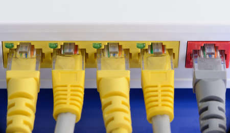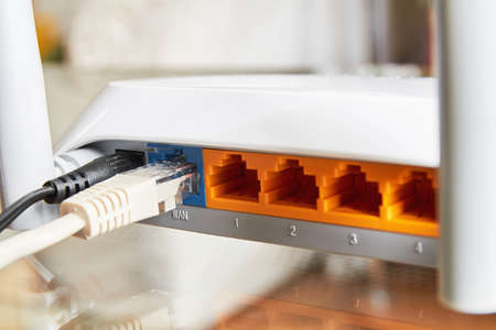 Internet cable plugs are connected to Internet Router. Close up. Selective focus.