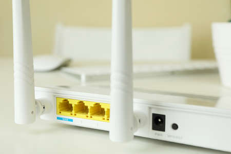 White wireless router on a glass table connected by cable to the Internet. Close-up