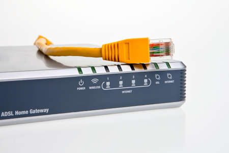 ADSL internet modem/router, front panel displays with yellow patch cord.