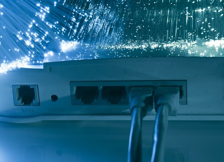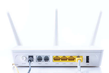 Wireless internet router with connected cables, The backside of fiber optic internet, and network cables connected to a router. Internet security and hi-speed concept. Selective focus.. Close-up
