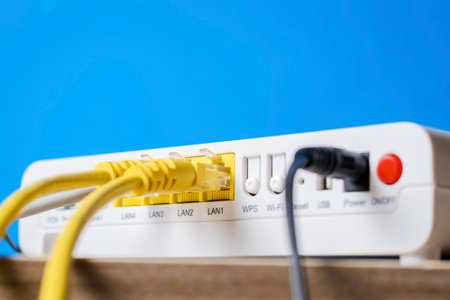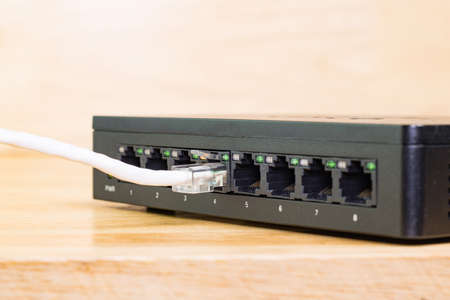 Close-up of blue network cable plug almost inserting into the socket of the white Wi Fi wireless router on a wooden desk. Home and office wlan router. Internet hardware macro shot. Rear view.