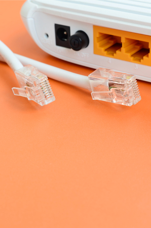 Internet router and Internet cable plugs lie on a bright orange background. Items required for Internet connection