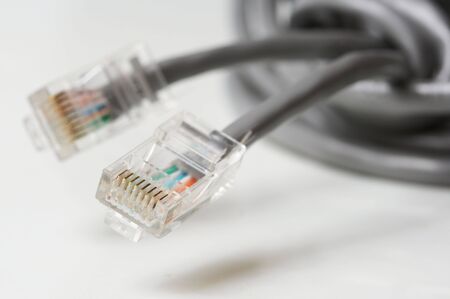 White internet connectors placed on grey surface, cable with plastic clip at tip