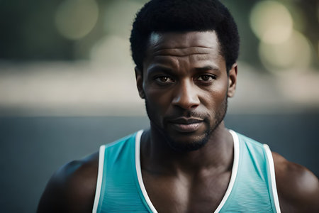 An inspiring image suitable for fitness publications, motivational content, or athletic wear campaigns | This powerful photograph showcases a male athlete in a moment of concentration and determination. His gaze is directed off-camera, possibly towards the goal he's set for himself or an upcoming challenge on the track. The athlete's muscular build is accentuated by the fitted black athletic wear, which reflects a professional and serious approach to his sport. His stance and expression convey a sense of readiness and mental preparation that is essential for high-performance athletes. The background is softly blurred, emphasizing the figure and creating a profound sense of depth, putting the viewer's full attention on the subject's intensity. The golden hour light gently illuminates the scene, highlighting the subject's skin tone and casting a natural warmth over the entire composition. The image depicts not just the physical aspect of sports but also underscores the psychological attributes of focus, ambition, and the inner strength required for athletic training and competition | Ideal for enhancing editorial pieces centered on personal growth, self-discipline, or discussions about the mental aspects of sports. It could also serve as a compelling visual for fitness coaches promoting their services, or as an aspirational image for workout spaces. Its use in advertisements for sportswear or fitness equipment would capitalize on the aspirational quality of the subject's physique and allure | a portrait of a focused athlete on a track field, representing the harmony of mental and physical fitness, captured in a setting that benefits from the soft outdoor lighting to accentuate the determination of the subject, with ample space for text overlays